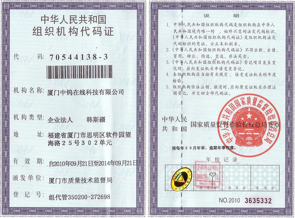 营业执照、税务登记证、代码证、出口资质、ISO9001:2008认证证书、闽B2-20090025、闽ICP备05002525号-1