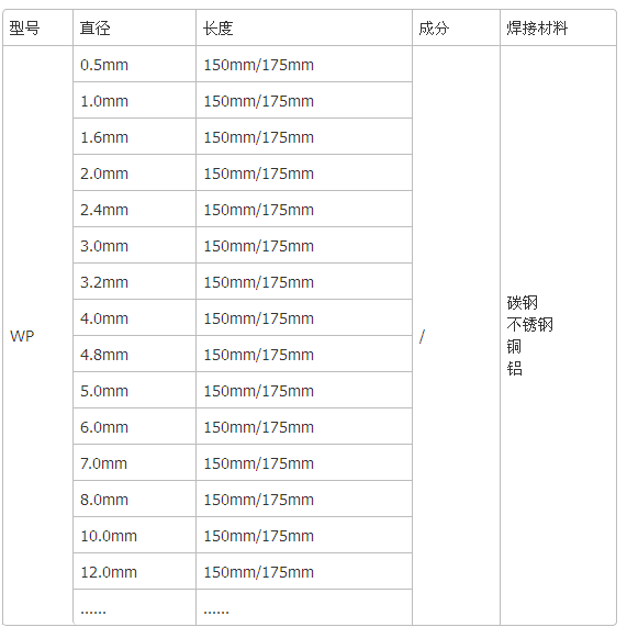 | 型号 | 直径 | 长度 | 成分 | 焊接材料 |